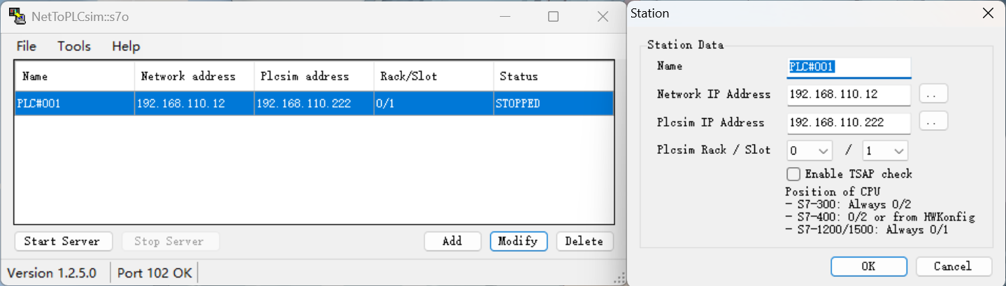 2.修改NetToPlcSIM,Network address为本机IP,后面为PLC的IP,后面的1200选择0/1。