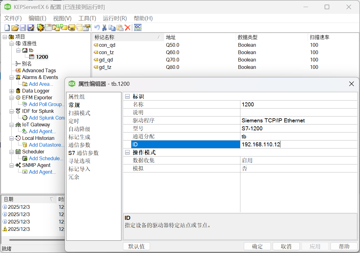 4.KepServerEX中在项目连接性里添加通道,驱动程序选择"Siemens TCP/IP Ethernet",通道名称自取,其余默认。接着,右键新建的通道,添加设备,名称自取,型号选择"S7-1200",ID选择本机IP。因为第二步中已经将PLCSIM地址映射到本机IP上了。
