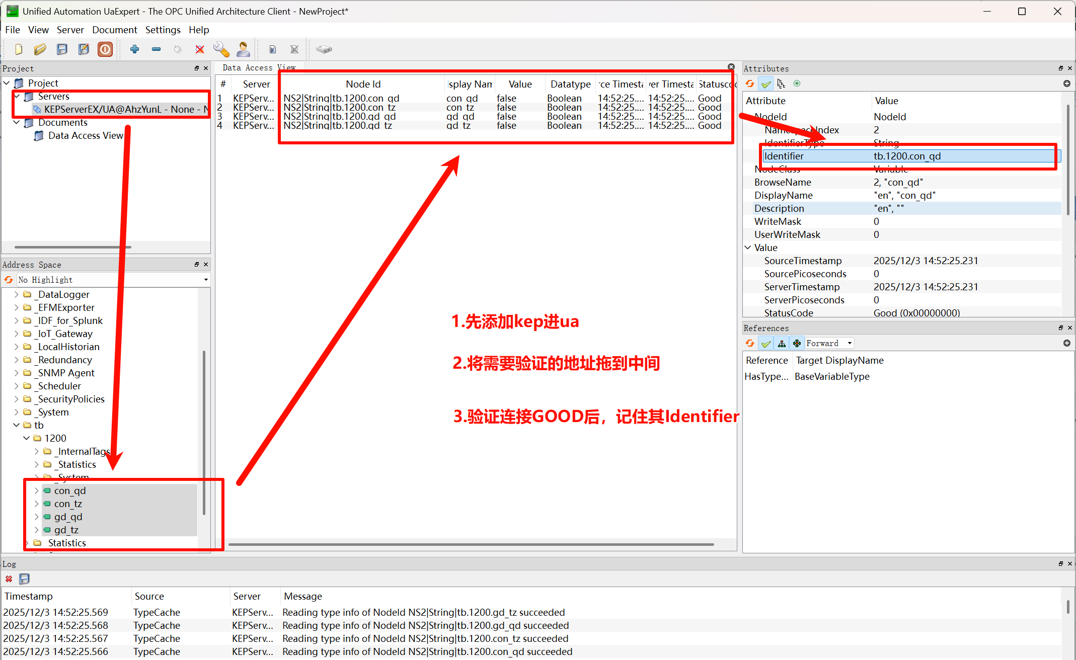 6.UaExpert作为OPCUA客户端先验证下OPCUA连接,验证成功需记住Identifier。